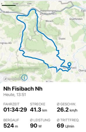 Nach ein paar trainingsfahrten mit den Elektrovelos habe ich mich auf die gleiche Strecke mit einem leichten Carbon Rennvelo von Specialized gewagt (2017). Für die fahrt auf den Regensberger (7-10km/h) brauchte ich rund 4 Minuten länger. (23 Minuten). Hinunter zeigte das GPS 58.5km/h ohne zu treten. So erreichte ich Fisibach in 70 Minuten. Nach 40km war der Bidon leer und ich wieder in Niederhasli.